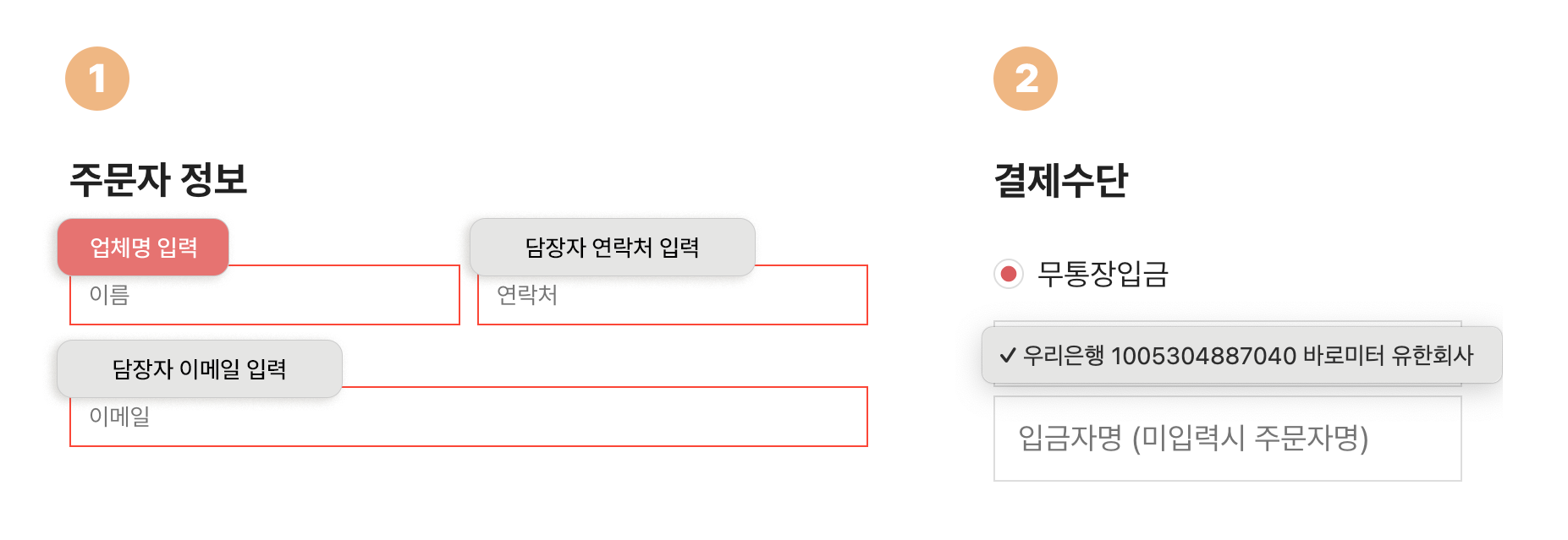 1. 주문자 정보에서 이름을 '업체명'으로 입력 해주세요.